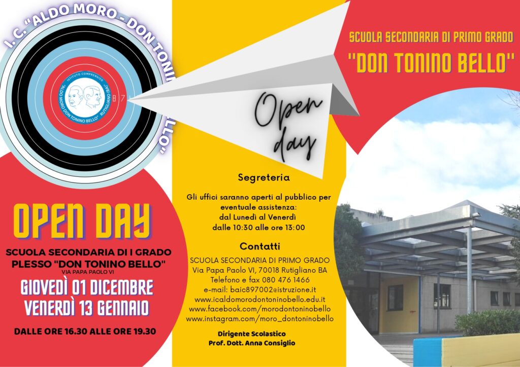 Il giorno 13 gennaio, si svolgerà un nuovo incontro di OPEN DAY, presso l’Auditorium del plesso “Don Tonino Bello” per l’iscrizione alle classi prime della SSIG. I genitori saranno accolti per conoscere l’Offerta Formativa, visitare insieme ai bambini gli ambienti didattici e assistere alla simulazione di lezioni multidisciplinari.
