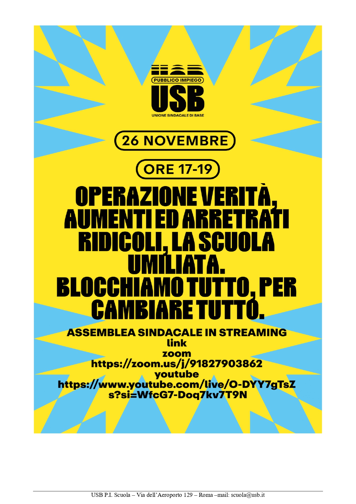 USB P.I. Scuola indice per il 26 novembre dalle ore 17 alle ore 19 un’assemblea sindacale in diretta streaming, fuori orario di servizio e pertanto senza diritto alla fruizione di permessi, destinata al personale docente e ATA: OPERAZIONE VERITÀ, AUMENTI ED ARRETRATI RIDICOLI, LA SCUOLA UMILIATA. BLOCCHIAMO TUTTO, PER CAMBIARE TUTTO.